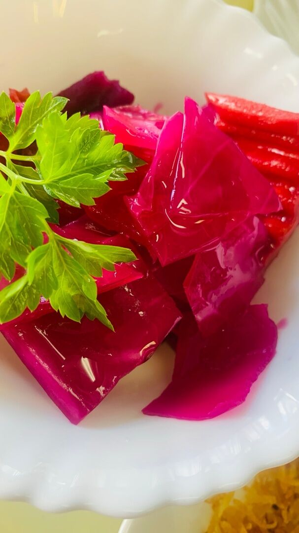 Состав: капуста б/к, морковь, свекла, чеснок, сельдерей стебель, перец черный горошек, перец душистый горошек, соль, рассол