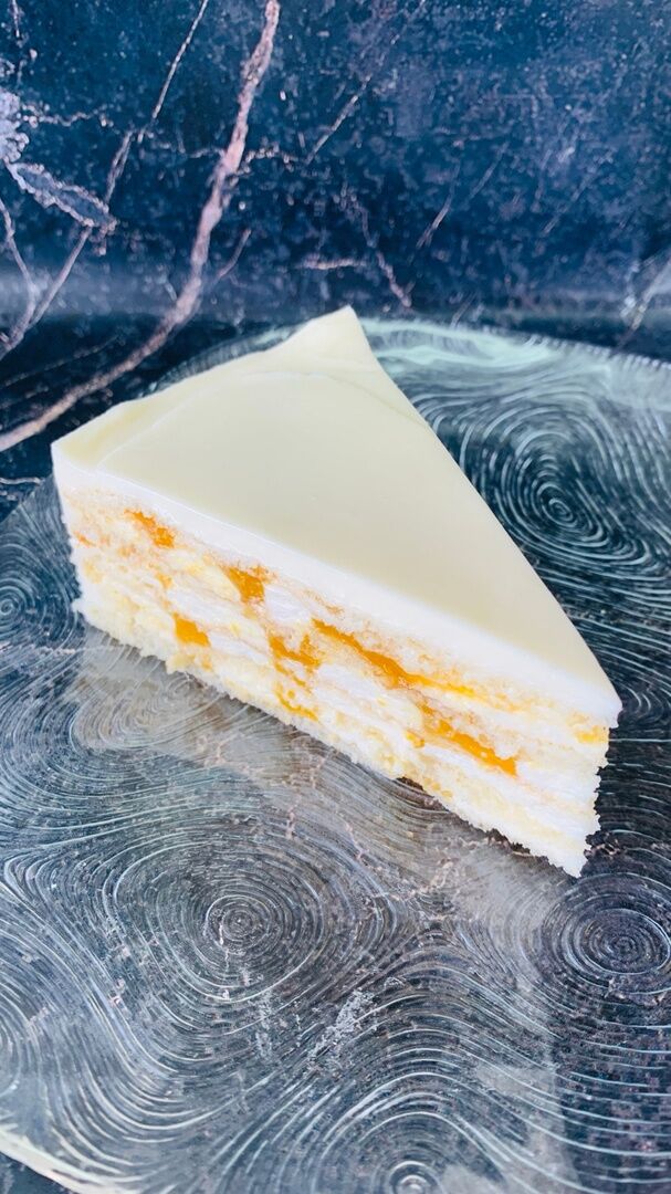 Нежный тонкий бисквит на сгущенном молоке, сливочный крем, конфи из манго
