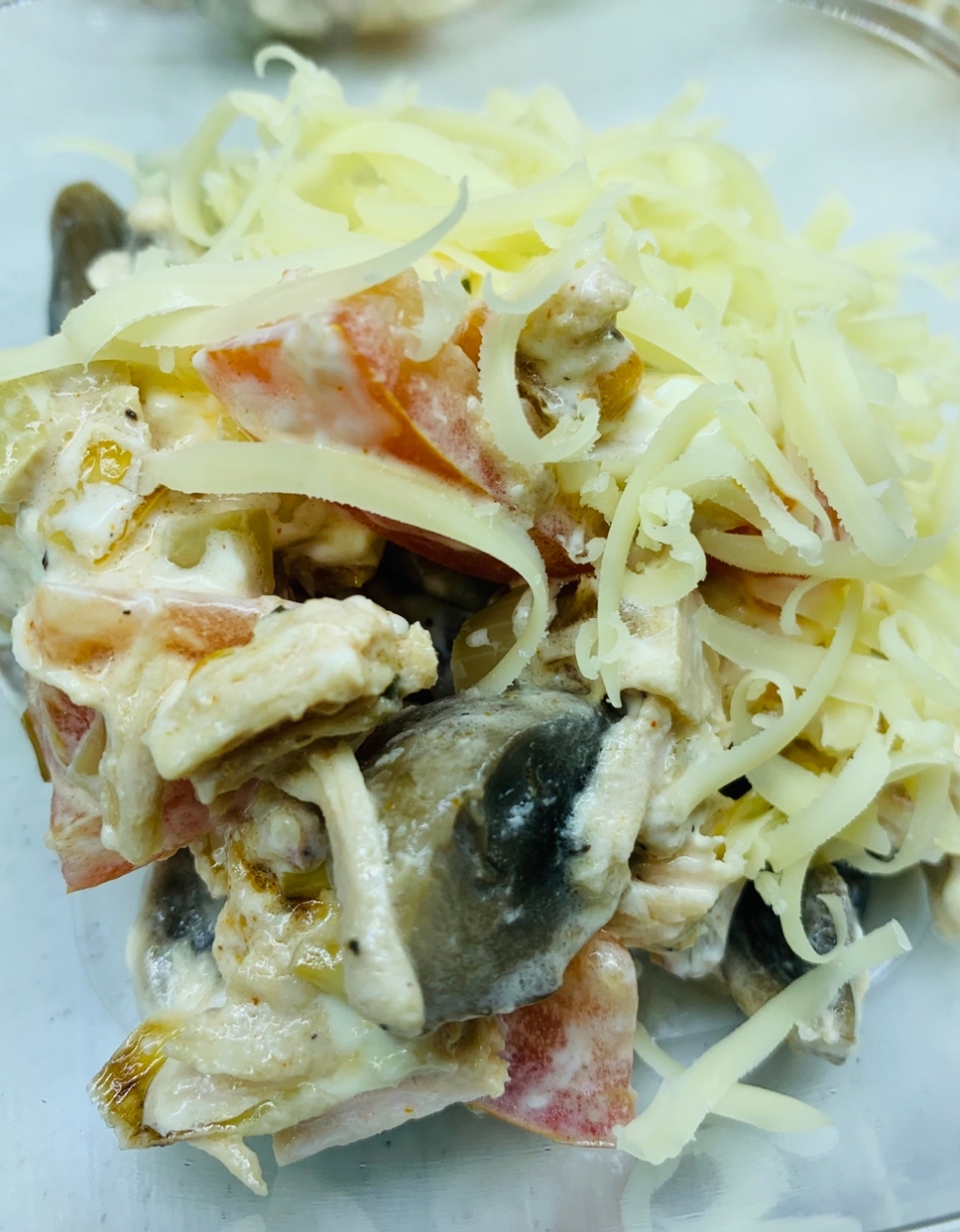 Состав: курица, шампиньоны, помидоры, лук, сыр, майонез