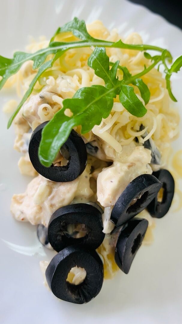 Состав: курица, ананасы консервированные, яйцо отварное, лук, маслины, сыр, майонез