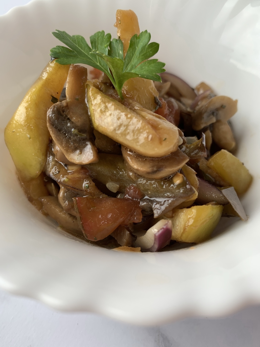 Состав: кабачки, баклажаны, помидоры, шампиньоны, лук, чеснок, заправка
