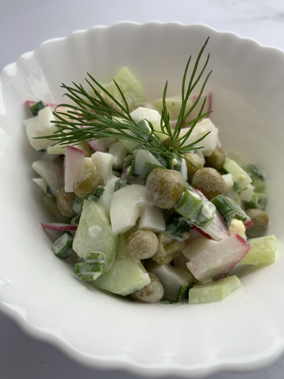 Состав: картофель, огурец, яйцо, горошек зеленый, редис, лук зеленый, сметана, майонез